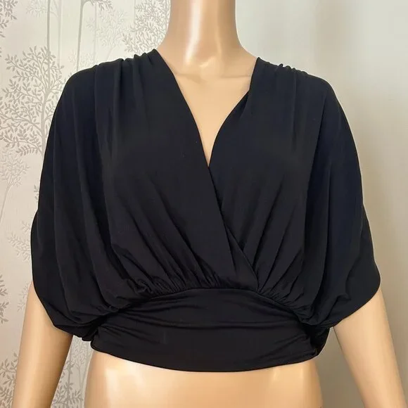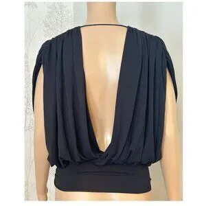 Sleeveless drape v-neck with stretch. Waist 12”. This is a sample piece so it is brand new, never worn.