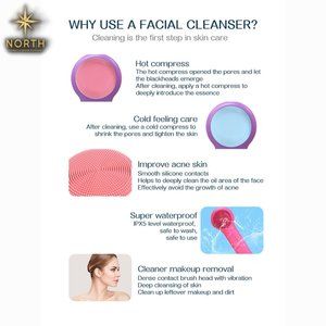 our " Electric Facial Cleansing Brush " From NORTH company , the brush is made of food-grade silicone which means a non-toxic type of silicone that doesn't contain any chemical fillers or byproducts which does not hurt the skin .. and it has The ultrasonic sound vibrations cause the pores in the skin to open up. As the pores open up, any excess oil or dirt in the pores is coaxed out by the ultrasonic vibrations and flushed away by the water. The pores are totally cleaned out.