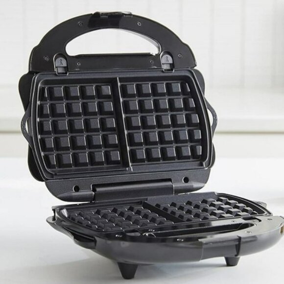 MULTI-FUNCTION 3-in-1 waffle maker that includes waffle iron, sandwich maker, and grill plate for cooking multiple dishes.