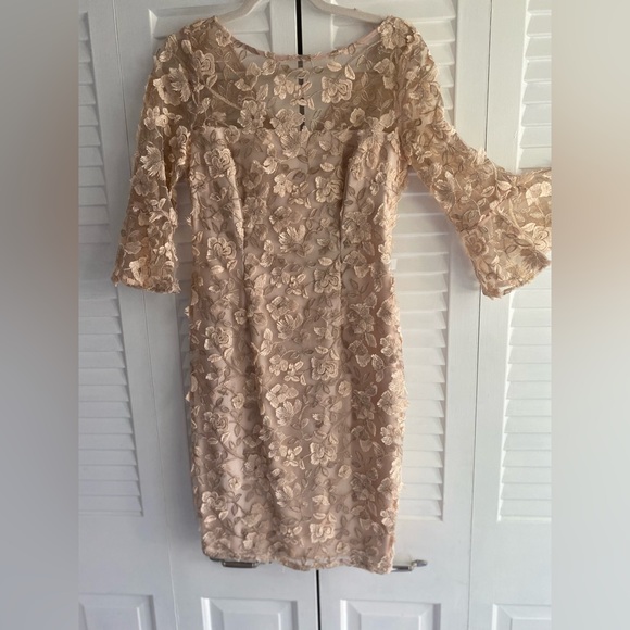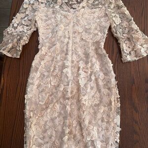This elegant lace floral dress features a beautiful blush color, perfect for any special occasion. The intricate floral design adds a touch of sophistication and charm. Purchased at Melanie Lyne