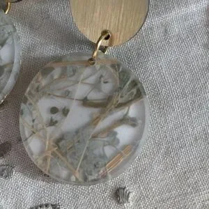 These elegant artisan disc earrings feature a beautiful blend of gold and cream tones, perfect for adding a touch of sophistication to any outfit. The pressed florals adds a delicate bohemian flair.