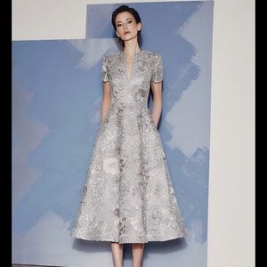 This custom Audrey & Brooks dress in a silver brocade is brand new and never worn. It was originally purchased for my daughter's upcoming wedding, but I've since chosen another outfit. There's no website posting as it was custom made, but I am including images of the fabric and style on the website for reference.