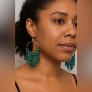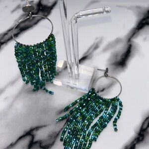 Elevate your style with these elegant beaded fringe earrings. Featuring a captivating blend of green and blue beads, they add a touch of sophistication to any ensemble.