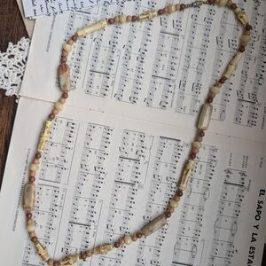 This elegant beaded necklace features a stunning combination of cream and brown tones. Perfect for adding a touch of sophistication to any outfit.