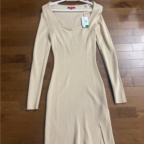 This elegant beige ribbed dress offers a sophisticated look for any occasion. The soft fabric and flattering fit make it a must-have in your wardrobe.