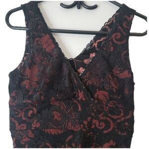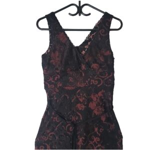Stunning fitted dress featuring a black floral lace overlay on a deep burgundy lining – perfect for cocktails, formal events, or date nights.