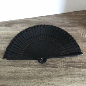 This elegant black hand fan features a beautiful floral design, perfect for adding a touch of sophistication to any outfit. Ideal for special occasions or everyday use. Made from a lightweight wood and hand painted design of florals and leaves. Lovely cutout design in the wood.