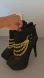 Step out in style with these elegant black heeled boots, featuring striking gold chain accents. Perfect for adding a touch of glamour to any outfit.