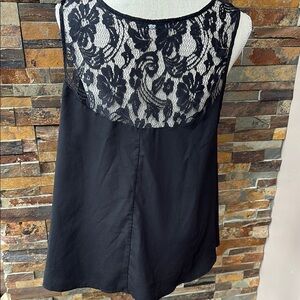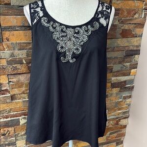 This elegant black top features intricate lace detailing and a stunning embellished design. Perfect for adding a touch of sophistication to any outfit.