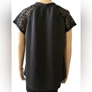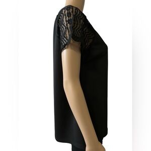 This elegant black top features delicate lace sleeves, perfect for any occasion. Its sophisticated design adds a touch of class to your wardrobe.