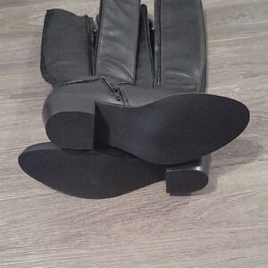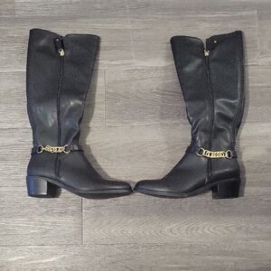Step out in style with these elegant black leather knee-high boots. Featuring a chic gold chain detail, these boots are perfect for any occasion. Pair them with your favorite outfit for a sophisticated look.