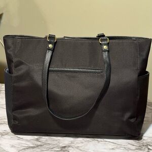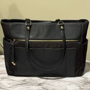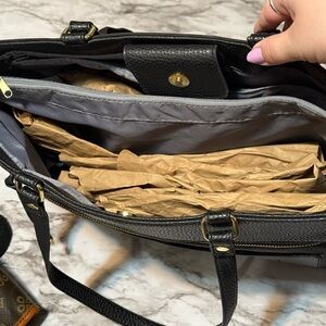 This elegant black faux leather tote bag is perfect for any occasion. Its sleek design and spacious interior make it a must-have accessory.