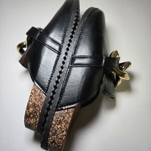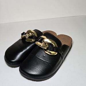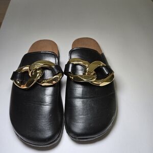 Step out in style with these elegant black mules featuring a striking gold chain accent. Perfect for any occasion, these shoes offer both comfort and sophistication. Minor everyday wear, see pics.