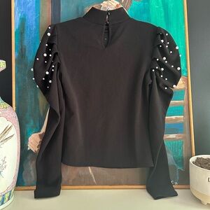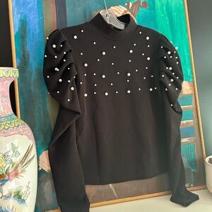 This chic black top features elegant pearl embellishments, perfect for adding a touch of sophistication to any outfit. Ideal for both casual and formal occasions.