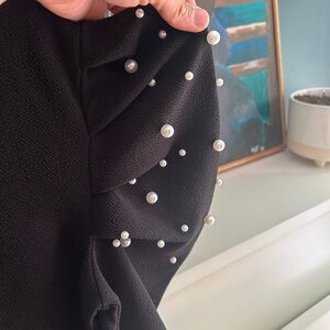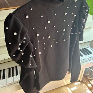 This chic black top features elegant pearl embellishments, perfect for adding a touch of sophistication to any outfit. Ideal for both casual and formal occasions.