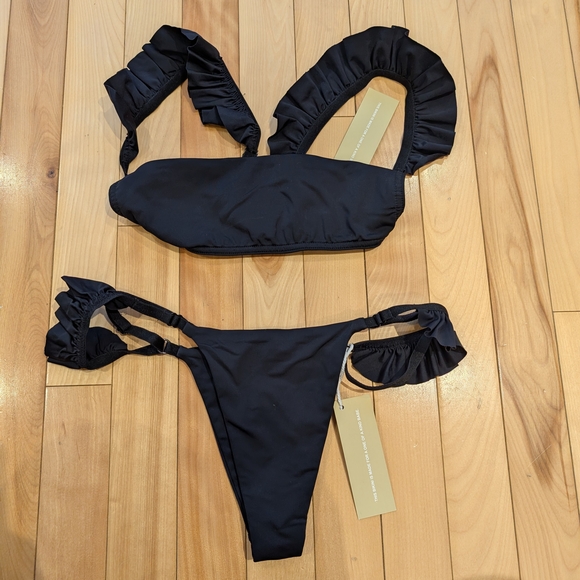 Dive into style with this elegant black ruffled bikini. Perfect for making a statement at the beach or pool.