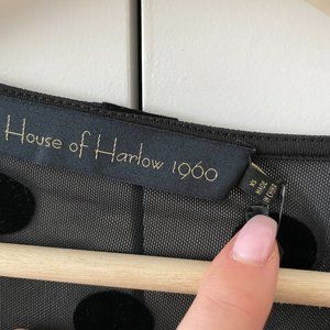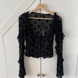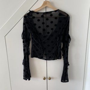 This elegant black sheer top features a stylish polka dot design, perfect for a night out. The long sleeves and unique cut add a touch of sophistication to your wardrobe.