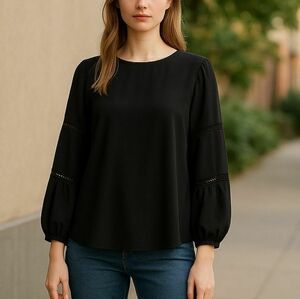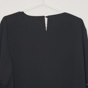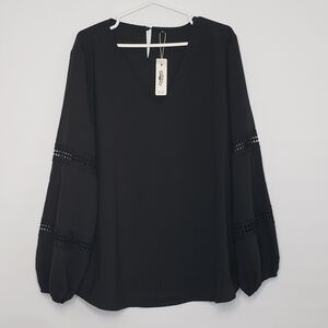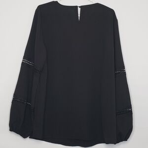 This elegant black V-neck top is perfect for any occasion. Its stylish design and comfortable fit make it a must-have in your wardrobe. Long balloon style sleeves with crochet inserts. Back keyhole button close 100% polyester