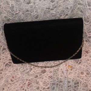 Chic black velvet clutch. Features a stylish chain strap. Perfect for evening events.