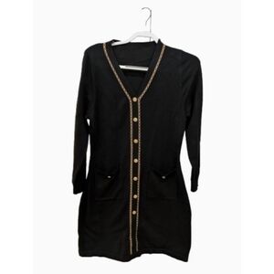This elegant black dress features a stylish button-down design (not real buttons), perfect for any occasion. The sleek silhouette and classic color make it a versatile addition to your wardrobe.