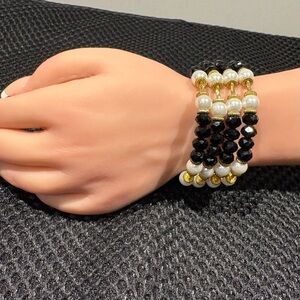Add timeless sophistication to your jewelry collection with this stunning coil bracelet, featuring alternating rows of glossy faux pearls and faceted black beads.