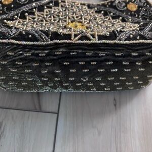 This stunning handbag features intricate beadwork in black and gold, perfect for adding a touch of elegance to any outfit. Ideal for evening events or special occasions.