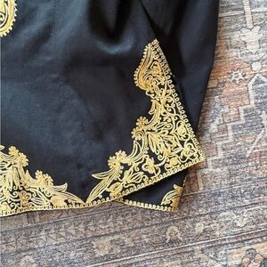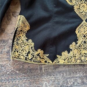 This sophisticated black blazer features exquisite gold detailing, perfect for adding a touch of elegance to any outfit.