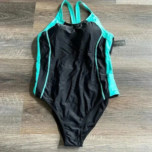 Make a splash with this elegant black and green one-piece swimsuit. Designed for comfort and style, it's perfect for your next beach day.