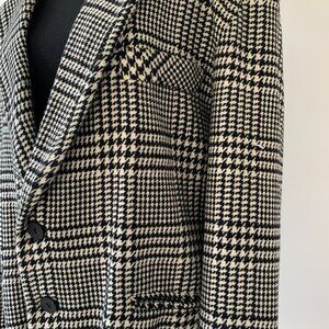 Step up your wardrobe with this elegant black and white houndstooth blazer. Its sophisticated design makes it perfect for both professional and casual settings.