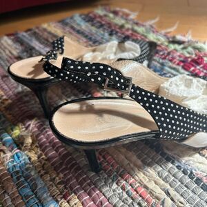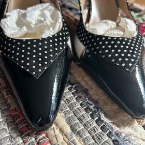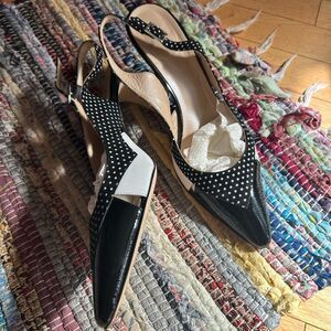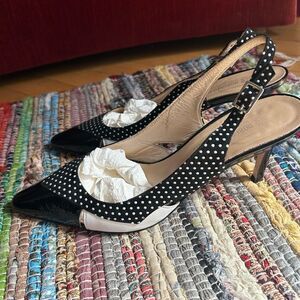 Step out in style with these elegant black and white polka dot slingback heels. Perfect for adding a touch of sophistication to any outfit. 9B. One scratch on right shoe see pics. Heel 3.5"