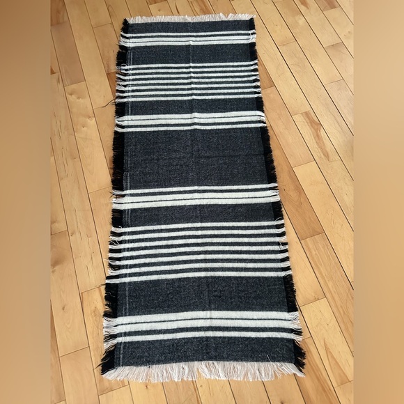 Enhance your style with this elegant black and white striped scarf. Perfect for adding a touch of sophistication to any outfit.