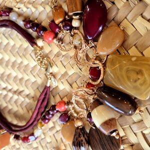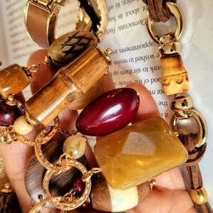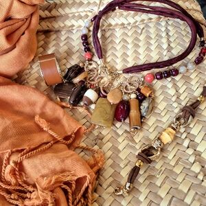 This stunning necklace combines the warmth of brown with the elegance of gold rich creams , tans and deep reds and woods , creating a captivating piece that exudes bohemian charm. the bracelet is in earthy tones as well on a leather rope. Finally the ponytail tie is a gold metal with tan . Its intricate design features a blend of metallic tones and decorative elements, making it a unique addition to any jewelry collection.