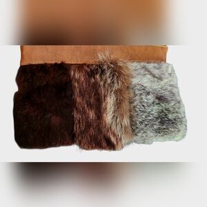 Add a sophisticated touch to your outfit with this stunning faux fur handbag in rich brown and soft grey tones.