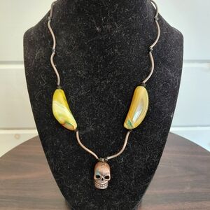 This stunning necklace features a captivating combination of brown and yellow tones, offering a unique and sophisticated look. Its elegant design is crafted with precision, making it a perfect accessory for any occasion. Add this timeless piece to your jewelry collection for a touch of elegance and style. Handmade and a unique one of a kind.