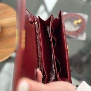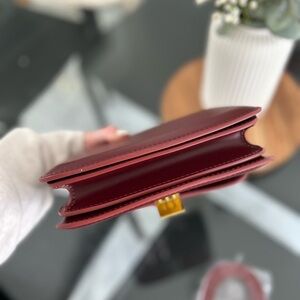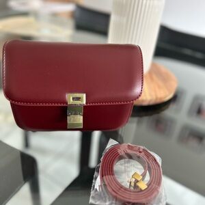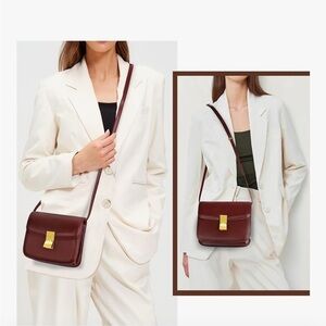 This elegant burgundy leather crossbody bag features a sleek design with a gold-tone clasp. Perfect for adding a touch of sophistication to any outfit.