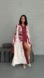 Stylish dress featuring a burgundy floral pattern on a white background. Long sleeves and button details add elegance.