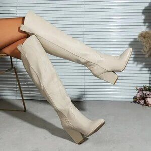 Step out in style with these elegant cream heeled boots. Perfect for any occasion, these boots offer both comfort and sophistication.