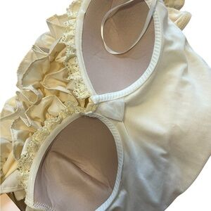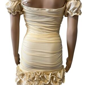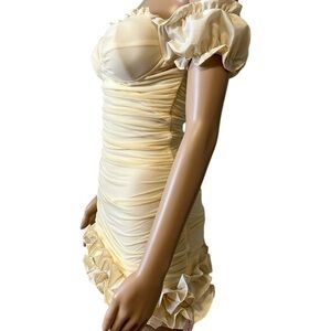 Step out in style with this elegant cream off-shoulder dress. Perfect for any occasion, this dress features a flattering ruched design and delicate ruffle details. A must-have addition to your wardrobe.