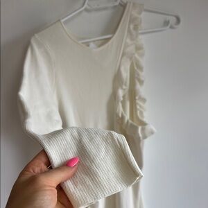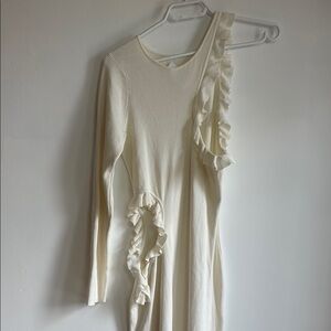 This elegant cream dress features stylish ruffle details, perfect for any occasion. Its sophisticated design offers a chic and timeless look.