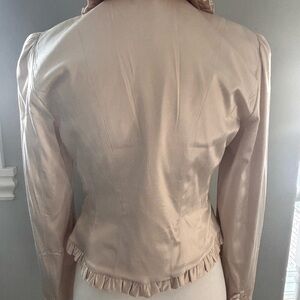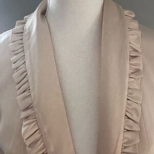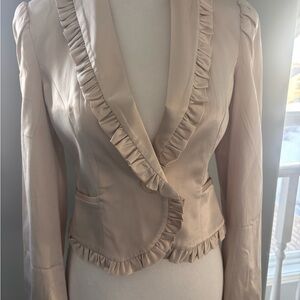 This elegant cream blazer features stylish ruffles, perfect for adding a touch of sophistication to any outfit. Ideal for both professional and casual settings. NWT Size 2