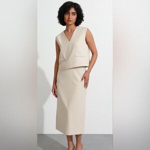 An elegant two-piece outfit designed with modern office sophistication in mind. The set includes a loose-fit V-neck blouse with broad shoulders for a structured yet relaxed silhouette, paired with a high-waisted long skirt featuring a sleek split and zipper closure for movement and grace. Crafted from a woven polyester–elastane blend, the fabric offers a soft drape without stretch, ensuring a polished shape. The plain apricot hue gives it a timeless and versatile appeal, perfect for professional wear or modest festive occasions such as Ramadan, Eid al-Adha, or Eid al-Fitr.