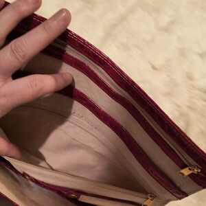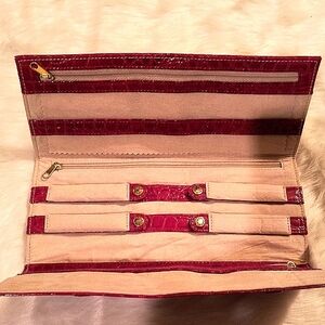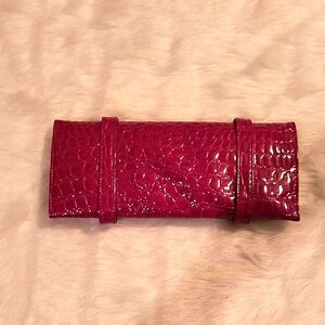This stylish red clutch features a sophisticated crocodile-embossed design.