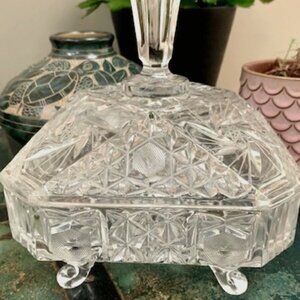 Elegant attention commanding square vintage clear precut glass covered bowl dish. This could be a great addition as a candy or serving dish and would be a perfect vessel to hold any jewellery or family heirlooms. Also would be stunning as a stand alone display piece.