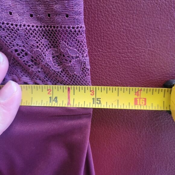 Indulge in elegance with this beautiful lace chemise. The rich burgundy color adds a touch of sophistication to your sleepwear collection. Perfect for a comfortable and stylish night in. Halter neck adjustable strap. Unlined sheer bust