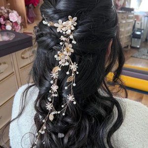 Enhance your hairstyle with this elegant floral hair vine. Featuring delicate white flowers and gold accents, it's perfect for any occasion.