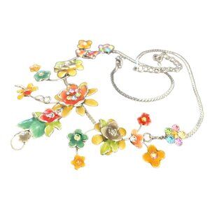 Glamourous Colorful Flower Necklace with Colored Gems, Adjustable Silver Chain, 15 inches smallest - 18 inches biggest, Pristine Condition, No Signs of Wear