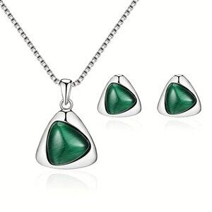 Elegant Geometric Necklace and Earrings Set – Green Triangle Pendant