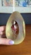 frosted art glass paperweight or sculpture featuring an internal pink and white swirl or spiral design. These items are typically hand-blown and are popular pieces of art glass.