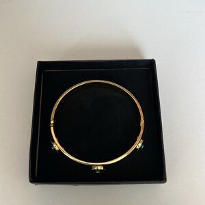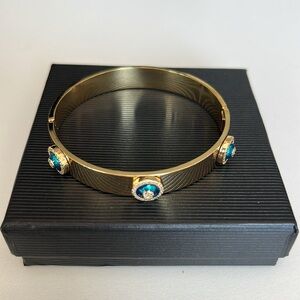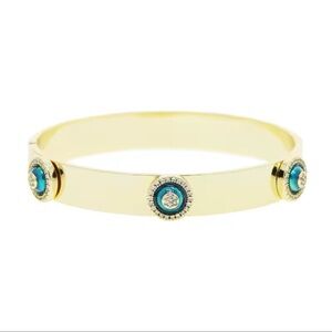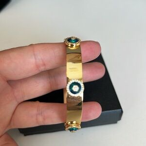 This stunning gold evil eye bangle features beautiful blue accents, perfect for adding a touch of elegance to any outfit.