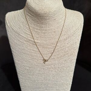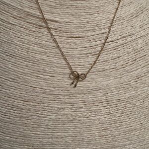 This necklace features a delicate and charming design centered around a small bow-shaped pendant. The bow is crafted from a twisted or rope-style metal, giving it texture and a sense of handcrafted elegance. It’s suspended on a fine, dainty chain, likely in a gold or gold-tone finish.